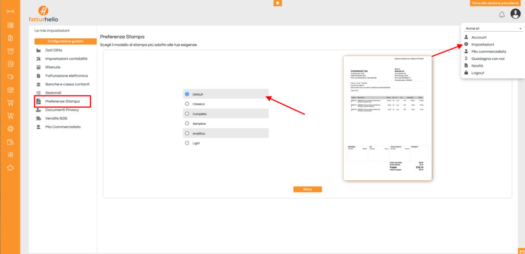 Per i clienti Fatturhello Premium Plus, il software gestionale per la fattura elettronica, è possibile personalizzare il layout di stampa PDF della propria fattura di vendita. Per scegliere il formato di proprio interesse è necessario accedere alla sezione delle Impostazioni del proprio portale e selezionare la voce Preferenze Stampa.
